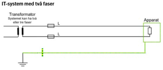 Några av IT-systemet egenskaper: Det utmärkande för IT-systemet är att transformatorn är isolerad från jord eller jordad med så hög impedans att felströmmen blir väldigt liten vid ett (1) fel L till PE.