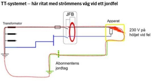 3) Nackdelen med TT-system är dock att vid jordslutning i apparaten blir det 230 V på höljet. Dessutom måste ström-men gå via abonnentens egen jordelektrod och jorden (marken) tillbaka till systemet. Felströmmen blir då sällan tillräckligt hög för att lösa ut säkringen. Jordfelsbrytare blir då absolut nödvändig för att garantera frånkoppling vid jordfel. Det är mycket viktigt att jordfelsbrytaren alltid fungerar i denna typ av nät.