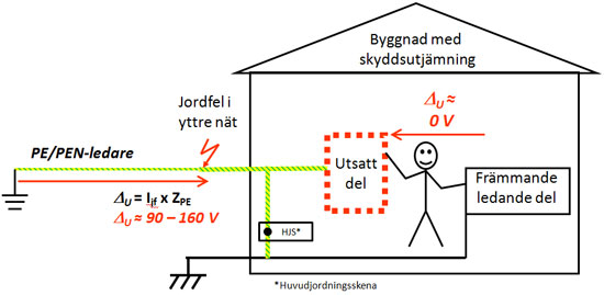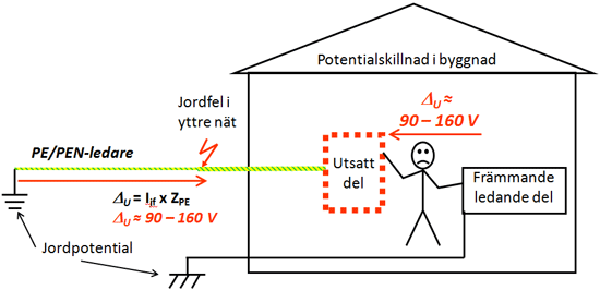 Ett fel utanför byggnaden kan orsaka farlig spänningsskillnad inne i byggnaden. Främst är det risken för kontakt med jordpotential som kan orsaka fara.