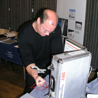 Patrik Wik som är produktchef på ABB försökte fresta deltagarna att testa hur det faktiskt känns att få ström genom armen. Eftersom få deltagare var karlar nog att anta utmaningen, eller helt enkelt inte tyckte om att få en stöt, visade han själv hur det skulle gå till och körde 30 mA genom underarmen.
