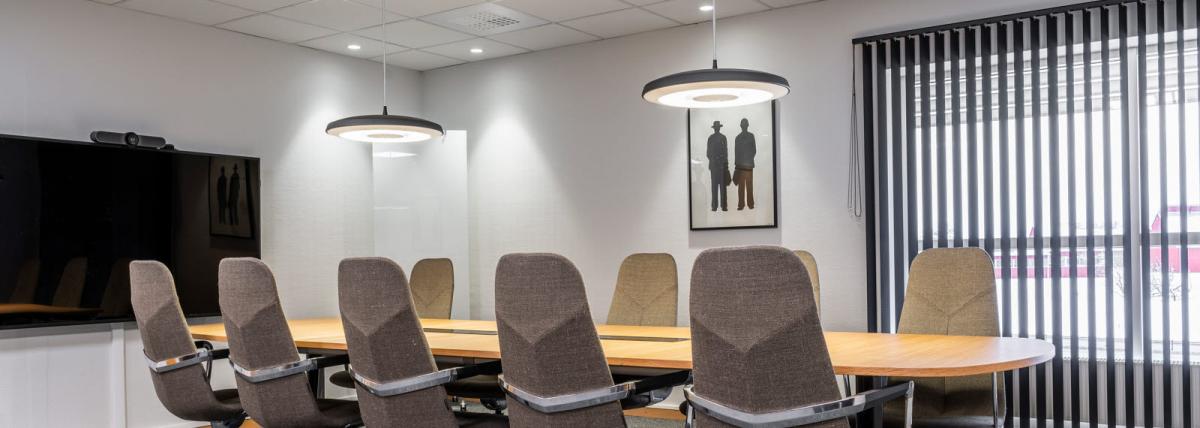 Zon två är själva konferensdelen. Där ville jag skapa en belysning som är både snygg och praktisk. Eftersom även konferensbordet är en plats där man sitter och arbetar i många timmar behöver även den arbetsbordsytan ha en bra belysning med 500 lux samt ett omgivningsljus på 300 lux. Här valde jag att använda en nedpendlad belysning med Galatea kombinerad med ett infällt allmänljus, Dimma TW.
