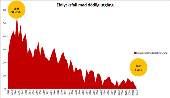 De senaste tio åren har siffrorna för elolyckor med dödlig utgång pendlat mellan två och åtta personer. Sedan 50-talet har kunskap, arbetsmetoder och elektrisk materiel förbättrats. Ett systematiskt arbetssätt har gett resultat. Det värsta året inträffade på 1940-talet med 56 döda.