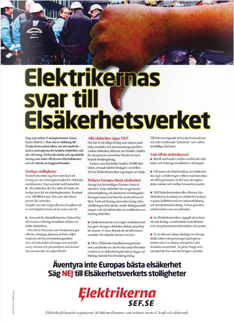 Elektrikerförbundet vill med hjälp av annonser i Metro uppmärksamma svenskarna på Elsäkerhetsverkets förslag till nytt framtida behörighetssystem. I annonserna skriver facket att det är ett byråkratiskt och opraktiskt förslag som leder till dyrare elinstallationer och ett elände på byggmarknaden.