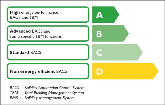 Motsvarar hög integrering/energieffektivisering med BACS och BMS (delvis integrerad och automatiserad styrning av värme, kyla, ventilation och belysning)