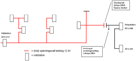 För att utföra arbetet med att öppna slackarna i stolpe 2804 öppnade den kopplingsansvarige frånskiljaren i nätstation ÄFS-311 och lämnade därefter arbetsbevis till den elarbetsansvarige. Åtgärden innebar att åtta nätstationsområden blev strömlösa. Den elarbetsansvarige utförde arbetet med att öppna slackarna och lämnade därefter driftbevis till den kopplingsansvarige. Kopplingsansvarige slöt frånskiljaren i ÄFS-311.