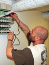 – Att jobba som elektriker kan slita hårt på axlarna, därför är det viktigt att göra allt som går för att ta hand om dem, säger Micke. Det gör man dels genom att träna, men också genom att jobba så ergonomiskt som det går. När man till exempel ska borra i en vägg så är det många som inte kliver upp tillräckligt högt på stegen så att de blir tvungna att hålla borren över huvudet. Genom att bara ta ett steg högre upp, så att borren kommer i brösthöjd, kan man minska belastningen på axlarna. Ett annat exempel är när man drar kabel i undertak. Om det finns plats så ska man försöka komma upp så högt att man kan dra från midjan, där man är som starkast.