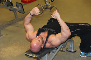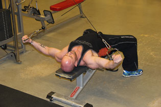 1. Ligg på en bänk med handtagen fästa i kabelmaskinens övre trissor.