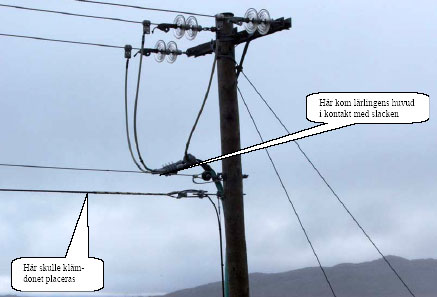 Den ene klättrade upp i stolpen för att fästa ett klämdon på optokabeln för att sedan kunna lossa sammanfogningen på den.
