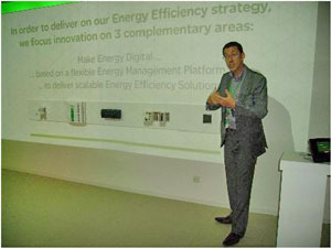 Schneider har en fortlöpande datainsamling, dag för dag, från sina kontor över hela värden. Rapporteringen omfattar energiförbrukning, utetemperatur mm. och presenteras som diagram i deras utställningshall. (Gissningsvis gäller det även rörelseresultat, men det visade man inte).