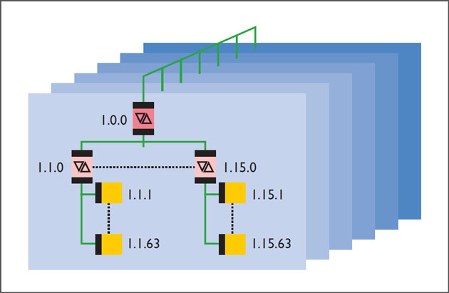 Ett förslag kan vara att dela upp sista sifferkombinationen i norm- och yttre monterade apparater, där 0 – 99 kan vara KNX-apparater i elcentraler och kapslingar, 100 – 199 KNXapparater för yttre montage, 200 – 255 för specialapplikationer. Det är som sagt valfritt att använda den tredje siffran på eget sätt, men det rekommenderas att man på något sätt skapar en struktur som passar för fastighetens uppbyggnad.
